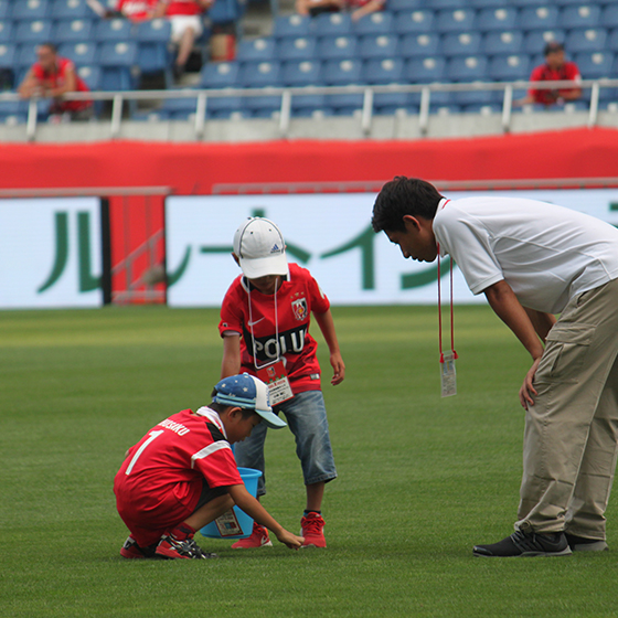 7月19日(日) 浦和レッズのホームゲームが行われる埼玉スタジアムメインピッチを整備する『グラウンドキーパー』のお仕事を体験していただくイベントを小学生対象に行いました。