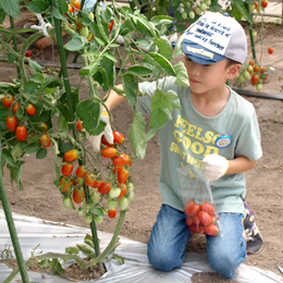 とりたてのミニトマトを味わいながら収穫します。