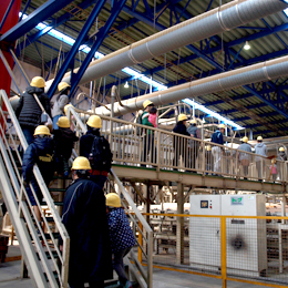 工場内の見学はヘルメットをかぶって頂き、工場長の解説をヘッドホンで聞きながら進みます。