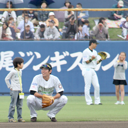 イベント当選者限定「親子ボールボーイ体験」の様子!バッド、ボール運びに加え、選手も試合も間近で見られる特別席です。
