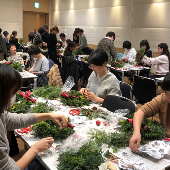 当日の会場は柏の葉カンファレンスセンター。午前の部、午後の部と2回のレッスンに、計34組83名の皆様にご参加いただき、講師である花屋四季旅人の小松先生そして3名のアシスタントの先生方に丁寧にクリスマスリースの作り方を教えていただきました。「サンキライ(山帰来)」「姫りんご」「松ぼっくり」などの飾り部分も、リボン以外は全て自然素材を使った本格的なクリスマスリース、お宅に飾っていただければと思います。