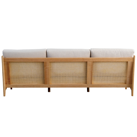 ロータイプ・アームレスでお部屋をすっきりと広く見せることができます。また、背面にはラタンをあしらい、後ろ姿も美しく軽やかな雰囲気に仕上げており、重厚感がありながらも、スタイリッシュな佇まいです。
