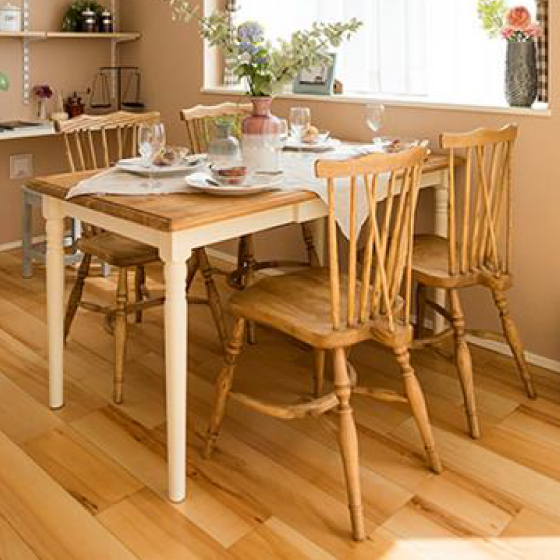 ぬくもりのある木の自然な木目と、ハンドメイド感ある優しいホワイトカラーの組み合わせが軽やかで可愛らしい雰囲気を伝えてくれます。