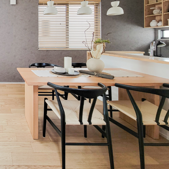 北欧を代表するデザイナー、ハンス・J・ウェグナーの『Yチェア』をリデザインした『リボーンチェア』で北欧テイストのダイニングチェアを。ペーパーコードの座面など自然素材を取り入れると◎
