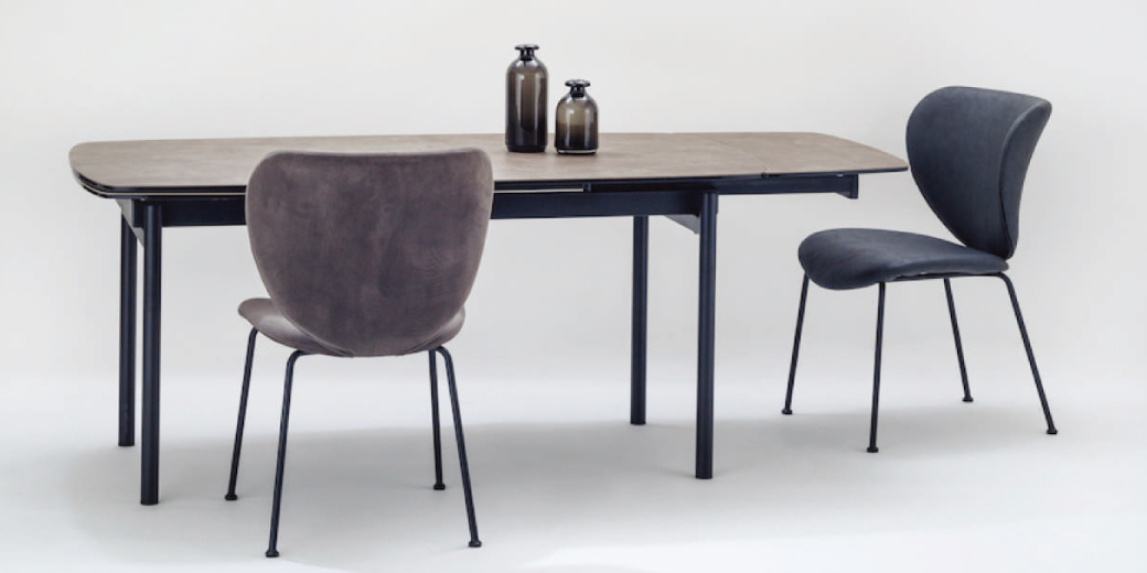 両側の天板が延長できるセラミックテーブル。軽い力で延長板の出し入れができます。天板のフォルムは緩やかな曲線を描き、硬い素材に柔和な雰囲気を与えています。