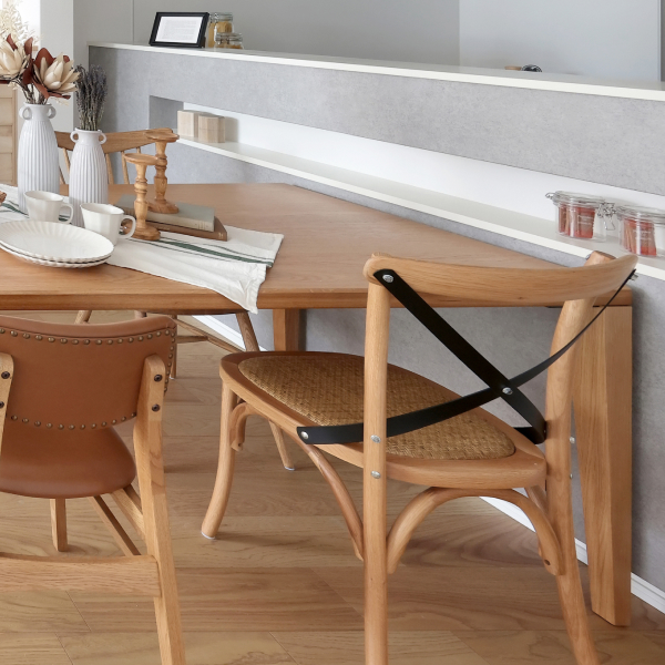 ヨーロッパのカフェなどで親しまれているヴィンテージチェアをモチーフに作られたチェア。籐を施した座と背のクロスしたスチールパーツが程よくカジュアルアップしています。