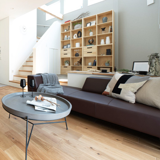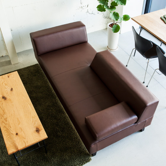 一部が抜けた背、片肘の構造のソファで、あらゆる方向へ座る事のできる開放感あるソファです。