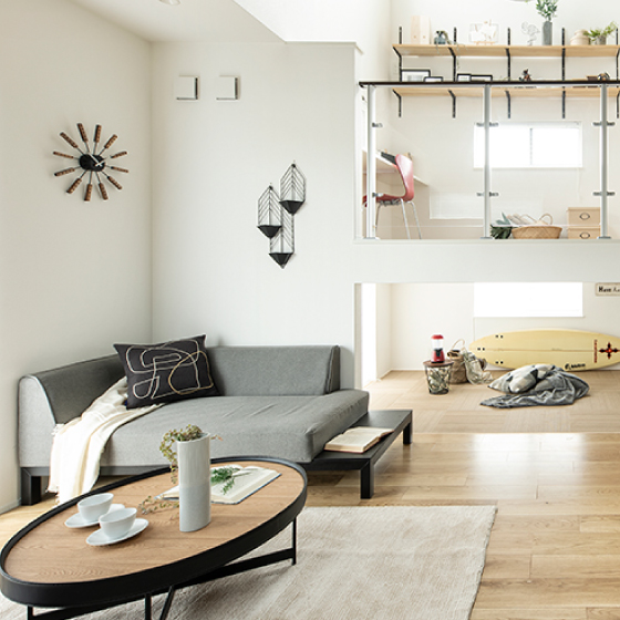 本やコーヒーカップが置ける、便利なサイドテーブル付きソファです。