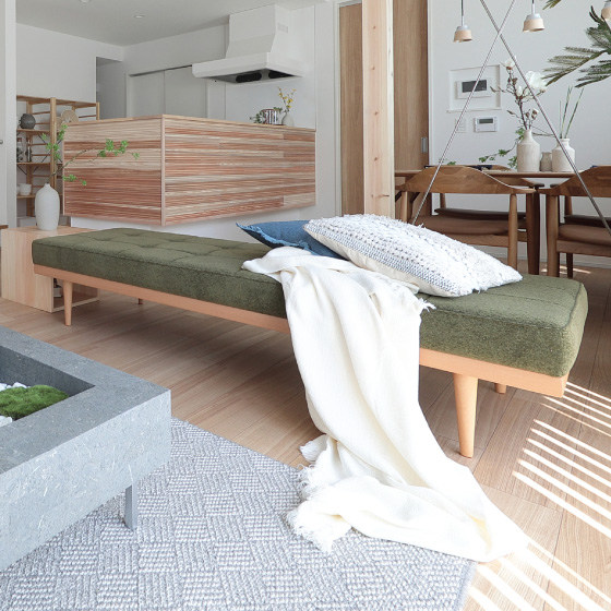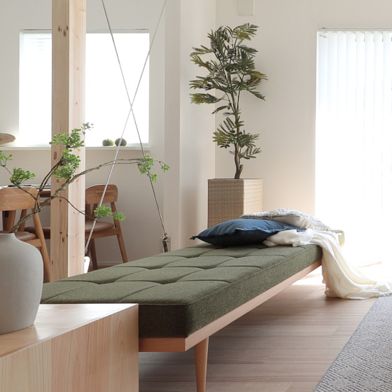 ぬれ縁をイメージしたベンチタイプのソファ。背もたれがないデザインは、空間を広く見せます。石目調の天板にスチール脚の異素材ミックスなテーブルを組み合わせて、和風すぎないトレンドを意識したコーディネートに。