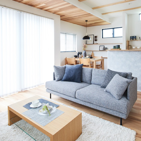 面積が大きいソファは、明るめのグレーをレイアウト。華奢なブラック脚のデザインで抜け感を意識したコーディネートに。