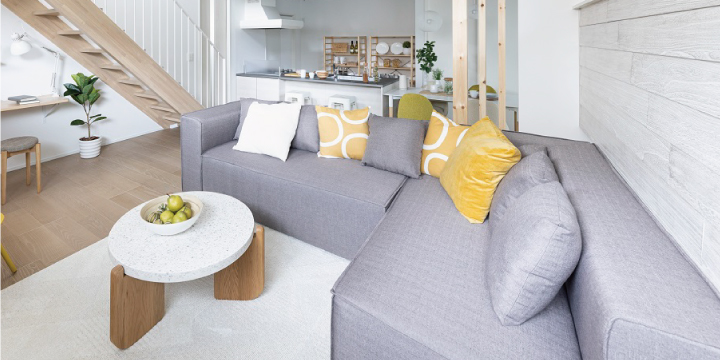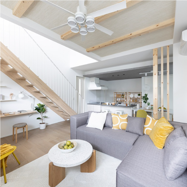 蹴込板のない階段と吹き抜けの効果で、大きめL字型ソファを置いてもスッキリ。キッチン天井のアクセントクロスと合わせてグレーをセレクト。