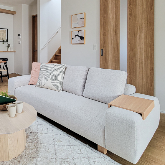 日本らしい『座』の空間をつくる低めのソファは、NOYESの『Decibel(デシベル)シリーズ』。人気のグレージュをセレクトし、温かみのある空間に。格子デザインがきれいなテレビボードともよく合います。