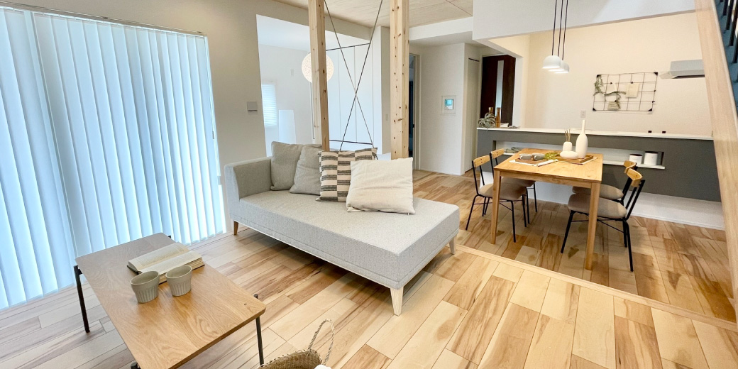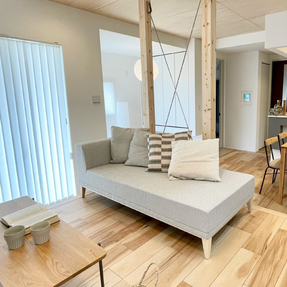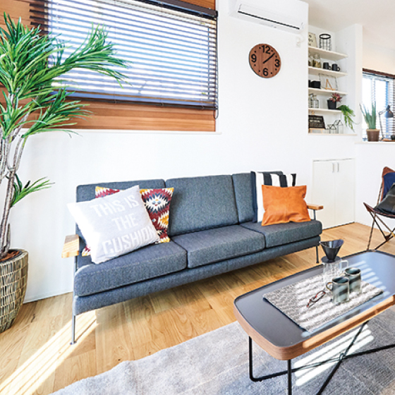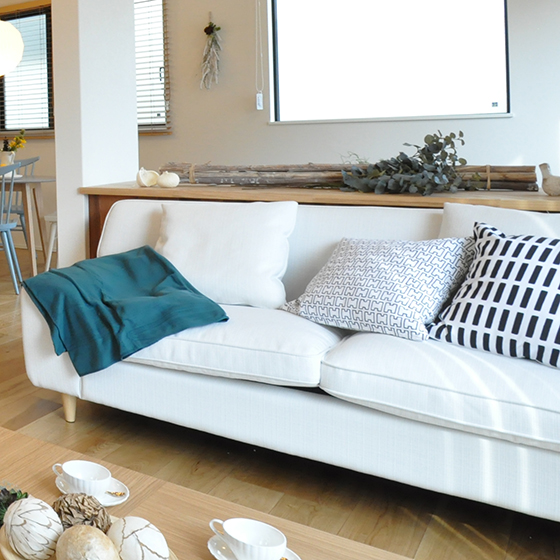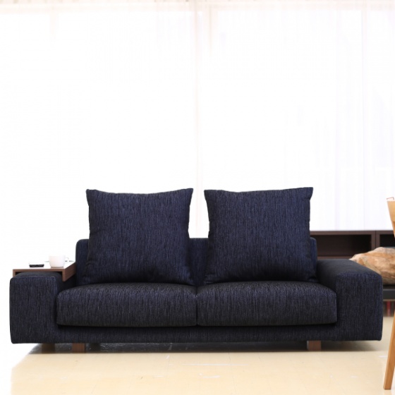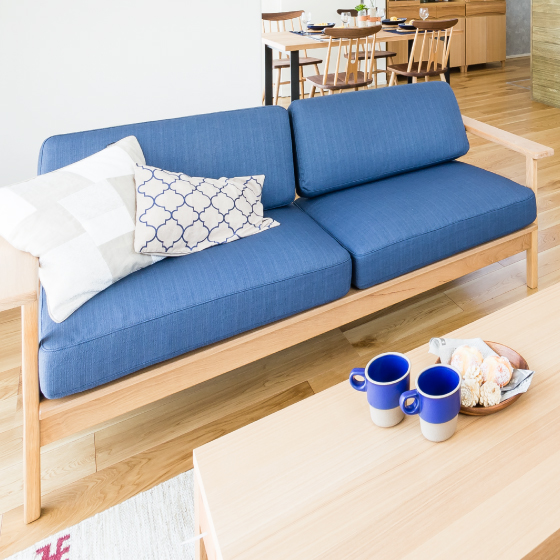 片肘タイプのソファは、通路側の導線に空間を作り、広くみせます。向きを変えて座れるデザインで、キッチンやダイニングにいる人とも会話がはずむ、デザイン面も機能面も◎な形です。