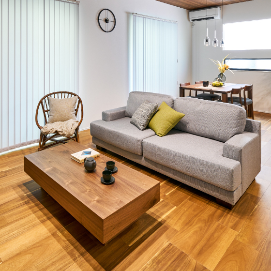 木調の家具ばかりだと重たくなってしまうので、脚をくぼませたデザインのリビングテーブルなら抜け感が出せます。