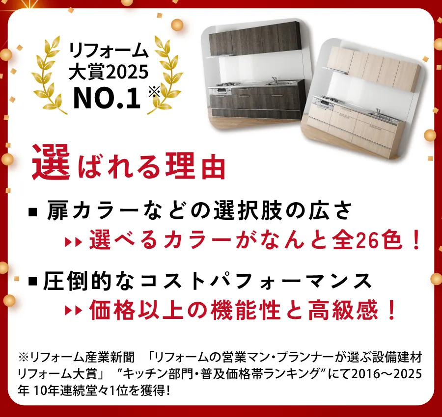 ※記載の金額は標準工事価格です。※お客様宅の状況により別途費用がかかる場合がございます。※既存システムキッチン交換の場合の価格です。※シンク、コンロ位置の左右変更は費用がかかりません。※キッチンパネル貼2面まで含みます。※内装工事・ガス配管・接続工事は、別途費用がかかります。※現地調査及びお打合せの上、正式お見積りを致します。詳しくはお問合せください。