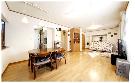 もともとは、リビング・ダイニング10帖と和室6帖だった間取りをリフォームで繋げ約16帖の広々空間へ。室内は、温かみのあるナチュラルテイストにまとめました。一緒に住むワンちゃんたちも広く新しく生まれ変わったお家に大満足の仕上がりですね。