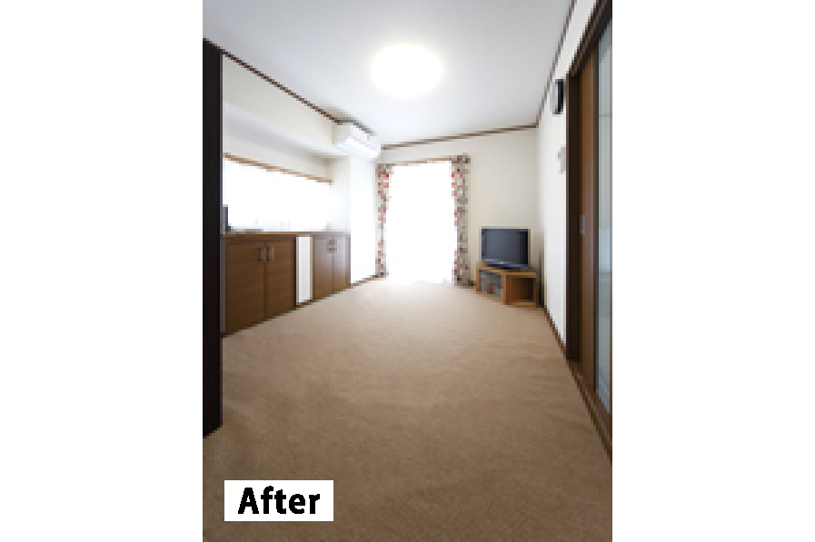 キッチンの位置を移動させ、LDK+和室だったスペースをキッチン+リビングダイニングに変更。1階リビングの掃き出し窓は防犯も兼ねてシャッター付き複層ガラスサッシに交換しています。