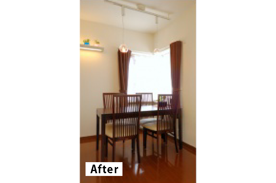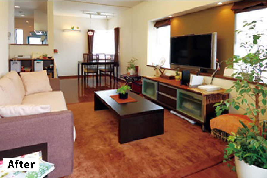 不要な個室の壁を取り払うスケルトンリフォームで、広々としたリビングとダイニング&キッチンを創出。落ち着いた雰囲気のリビング。カーテンレールが見えないように、天井にレールボックスをつくり、スッキリとした空間をつくりだしている。また、リビングとダイニングは、すべてダークブラウン系の家具で統一し、TVの背面のみ茶色のアクセントクロスを採用。直径の小さなダウンライトでアクセントクロスを照らしている。
