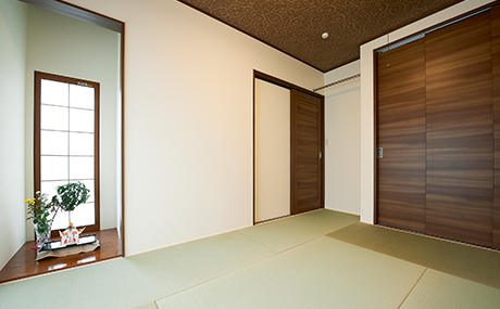 あまり使われていなかった8畳の和室は6畳へ間取り変更。スタイリッシュな現代風和空間へとリフォームしました。床畳には縁なしの畳、天井クロスには模様の美しいインパクトのあるものを採用。バランスのよい素敵な空間となっています。窓にはインナーサッシを採用していますが、障子調のものを取り入れることで、和の空間を壊すことなく機能性を向上させています。