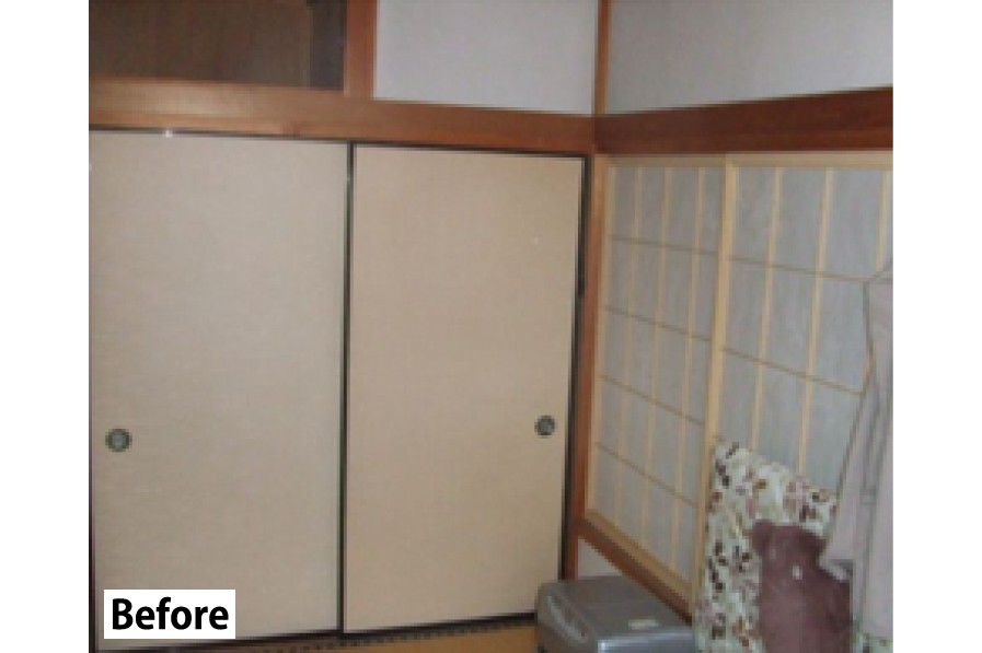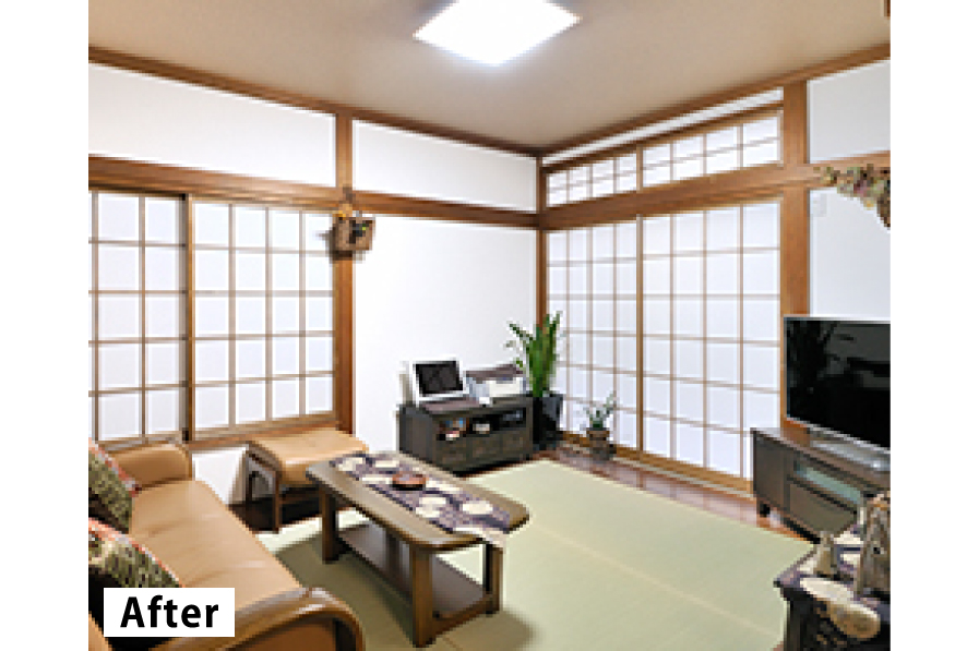 LDKに隣接する和室をもっと有効的に使いたかったとK様ご夫婦。ご主人様は、和室をLDKに取り込み1つの大きなフローリングの空間としたい。奥様は和の空間は残したい、LDKと繋がる開放的な民芸調和室にしたいとのご要望でした。そこで、純粋な和室になり過ぎない引き戸で開け閉め出来る和空間を提案しました。ポイントは畳を中央に寄せ周りをフローリングで囲った「和モダンテイスト」の床デザインです。