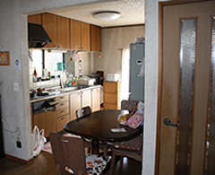 キッチン室とダイニング空間が一緒になった間取り。テーブルの横は玄関ホールとつながる扉があった所。実際には使われていなかったため、塞いでしまいガラスブロックを並べて空間のアクセントにしたのがポイントです。※参考価格にはキッチン設備費は含まれていません。