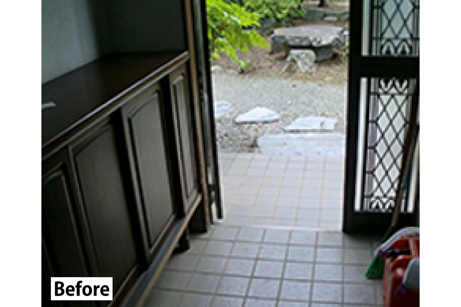 増築・階段部分の架け替えを実施し、シューズクロークを設けました。6人分の靴や玄関周りの日用品が、シューズクローク内にしっかりと片付けられる様になりました。