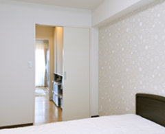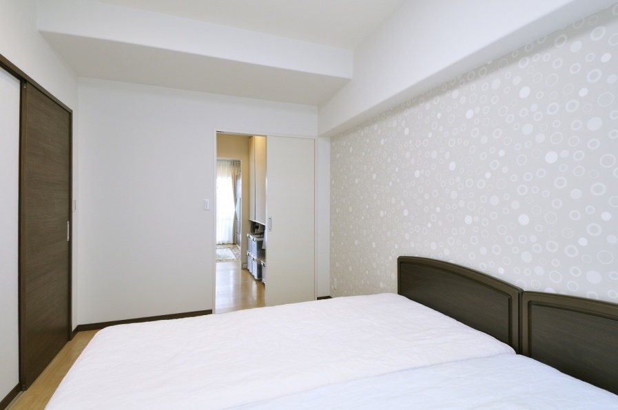 | 目的/動機 | ご夫婦の寝室は、壁の一面のみにグレーのアクセントクロスを採用し、落ち着きのある空間に。また、リビングと寝室の間に新設したウォークインクロゼット。両部屋から出入りすることができ、開け放てば風の通り道としても活躍します。「ウォークインクロゼットを通して、リビングのバルコニーから寝室のバルコニーに風が抜けるようになりました」とA様。 |